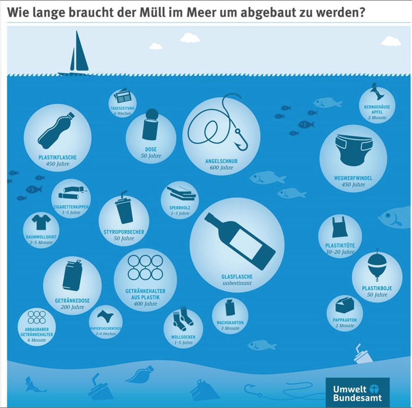 Die Funde am Strand geben ein gutes Abbild von dem, was im Wasser treibt. Gut 80% des Meeresmülls besteht aus Kuststoffen. Diese sind sehr langlebig und brauchen so um die 450 Jahre, bis sie zersetzt sind.